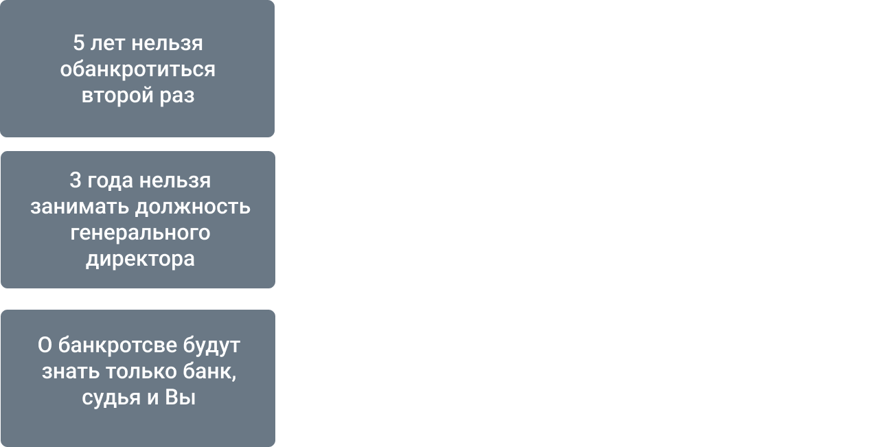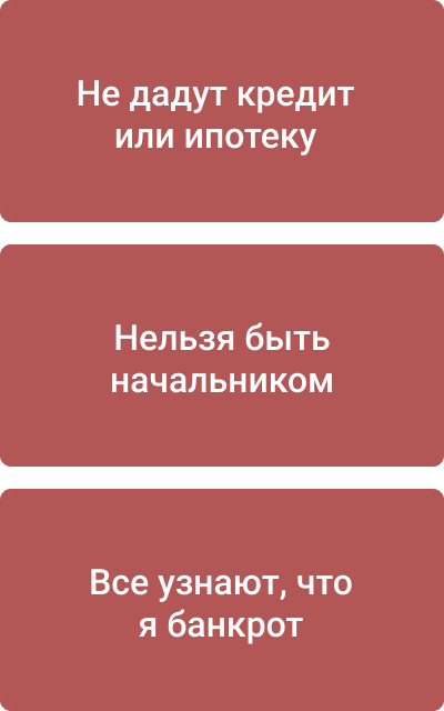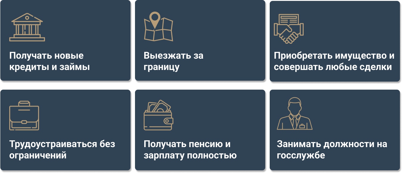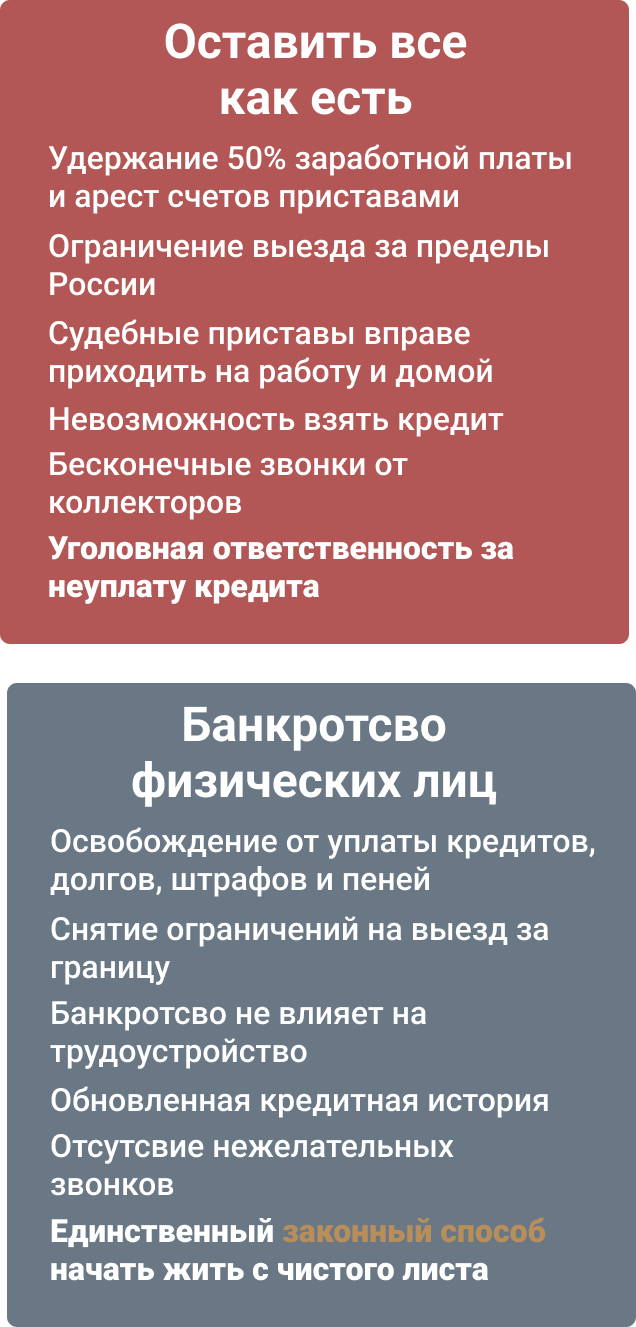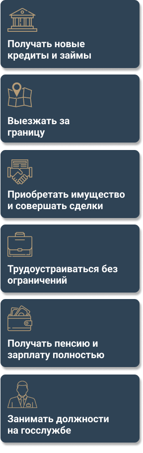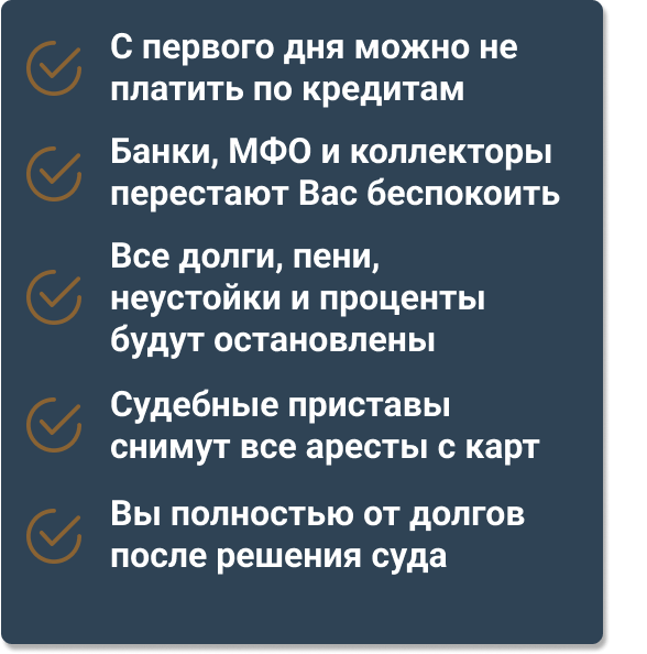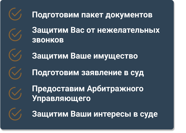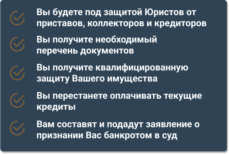 1. Вы будете под защитой Юристов от приставов, коллекторов и кредиторов. 2. Вы получите необходимый перечень документов. 3. Вы получите квалифицированную защиту Вашего имущества. 4. Вы перестанете оплачивать текущие кредиты, на законных основаниях. 5. Вам составят и подадут заявление о признании Вас банкротом в суд.
